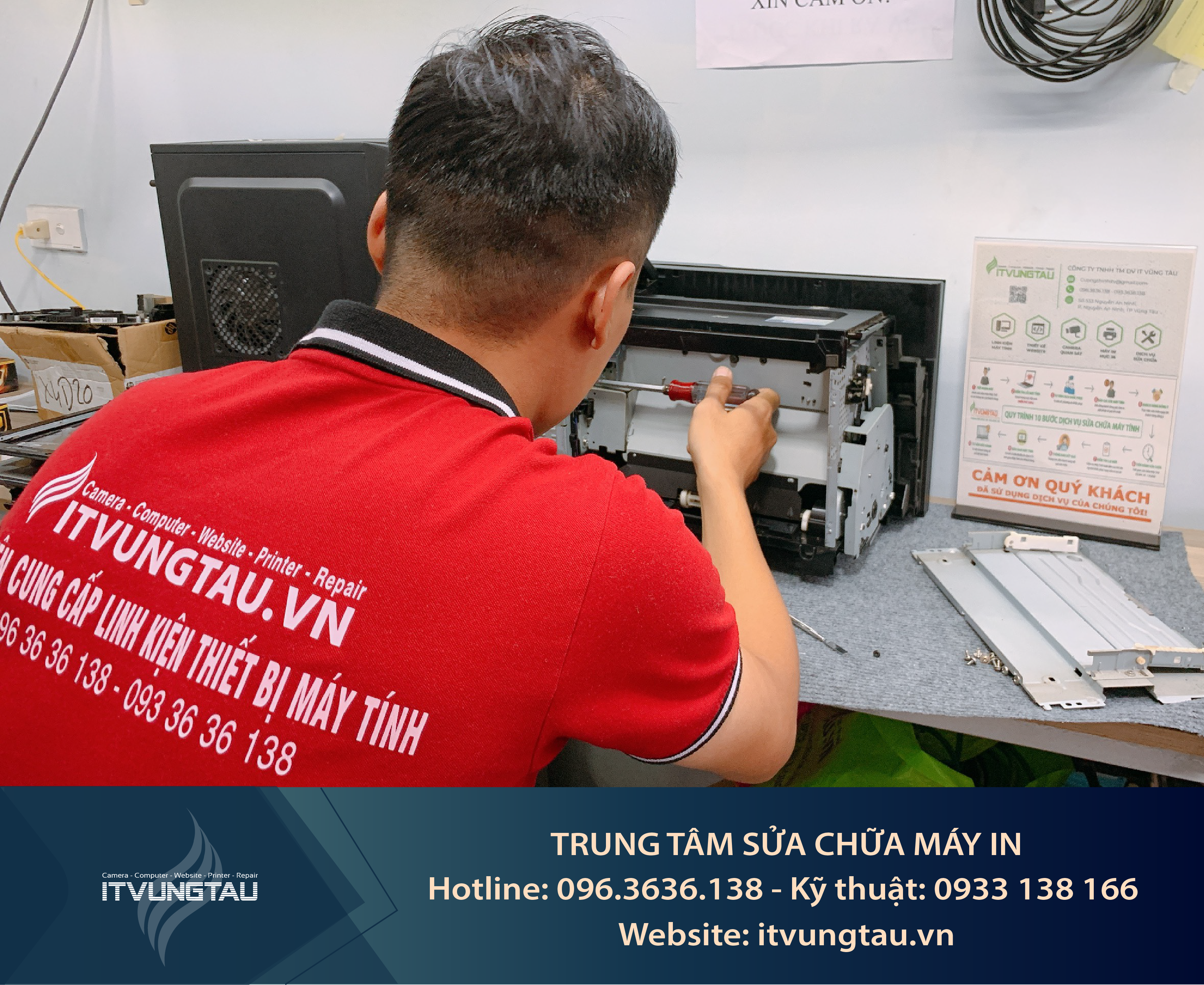 Quy trình sửa máy in Vũng Tàu của It Vũng Tàu: Chúng tôi kiểm tra lỗi máy in, sau đó thông báo các lỗi mà máy in mắc phải. Sau đó chúng tôi báo giá trước khi tiến hành sửa chữa, sau khi khách hàng đồng ý sửa chữa thì chúng tôi tiến hành sửa máy in. Khách hàng kiểm tra lại các lỗi máy in và trả tiền theo thỏa thuận.